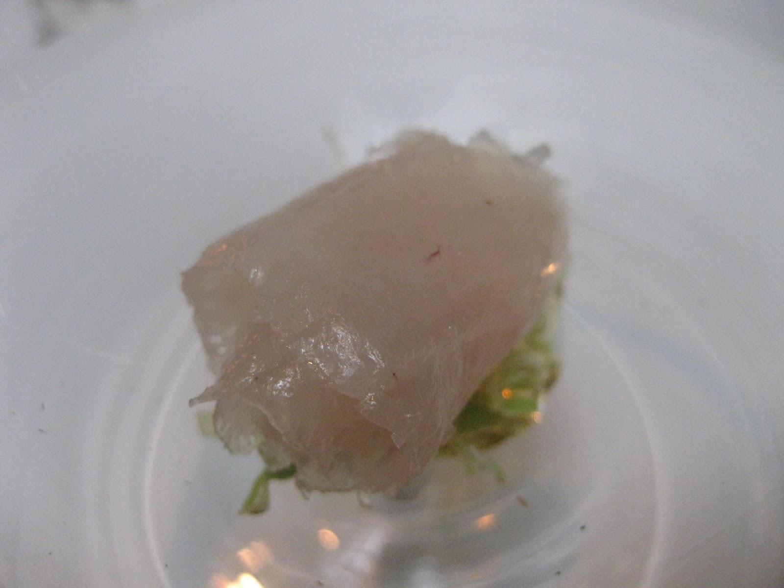 Our next course was easily the most interesting dish of the evening. First, chopsticks were placed on our table, a utensil I was unaware the French Laundry having. Next, we were given glass bowls filled with smoke before the lids were removed. The smoke cleared revealing a Sashimi of Kona Kampachi with Pickled Savoy Cabbage, Blis Maple Syrup and Applewood Smoke. The kanpachi had the faintest smokey flavor which paired very well with the sweet and crunchy cabbage.