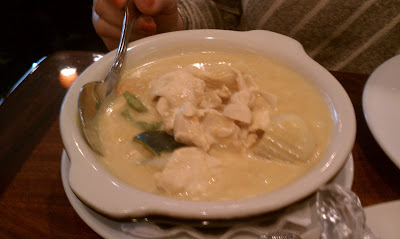 Tom kah kai (inexplicably not pictured) had a sharp undertone of lemongrass balanced by the creaminess of the coconut soup. We requested this moderately spicy , but the spoonfuls containing chili delivered the heat. We'd eaten the same dish at the Manhattan branch, but here each individual flavor was far more focused.